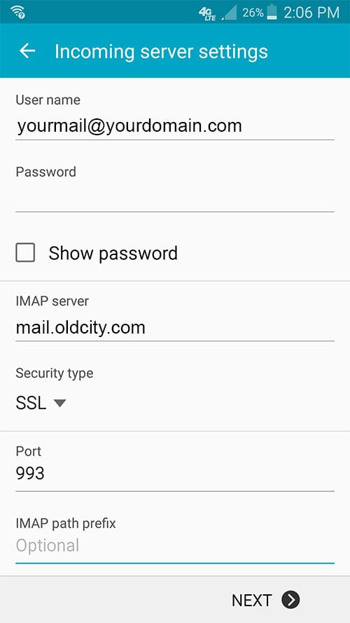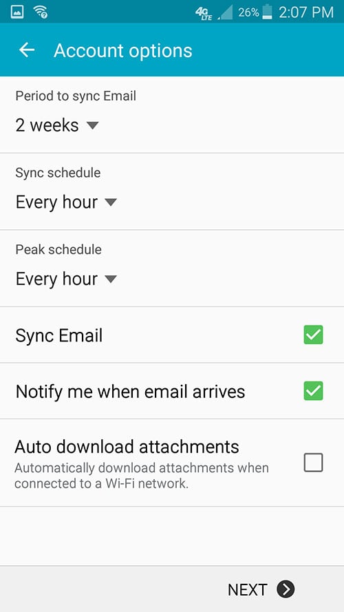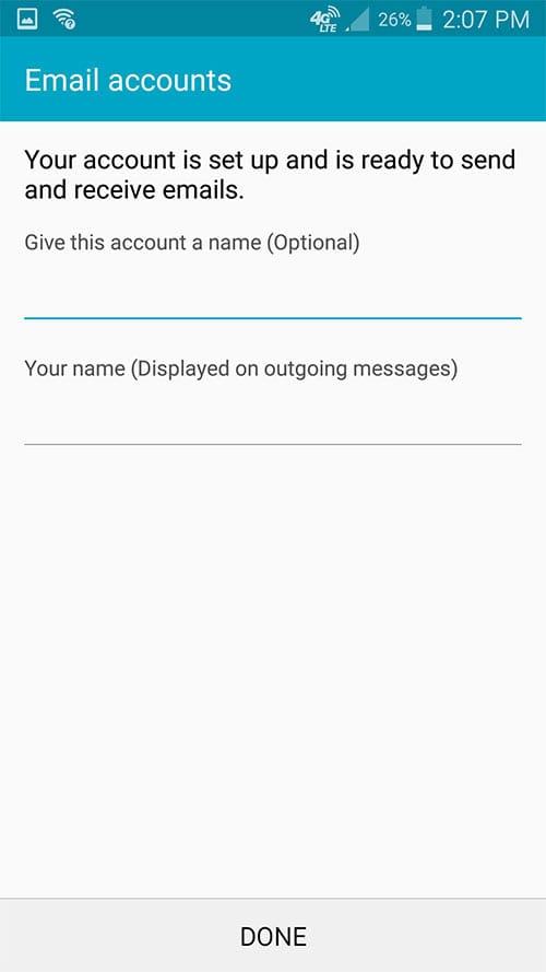 15. Feel free to enter your Email Address or your Name to distinguish this account from others on your device, as well as entering the name that will be displayed on outgoing messages.