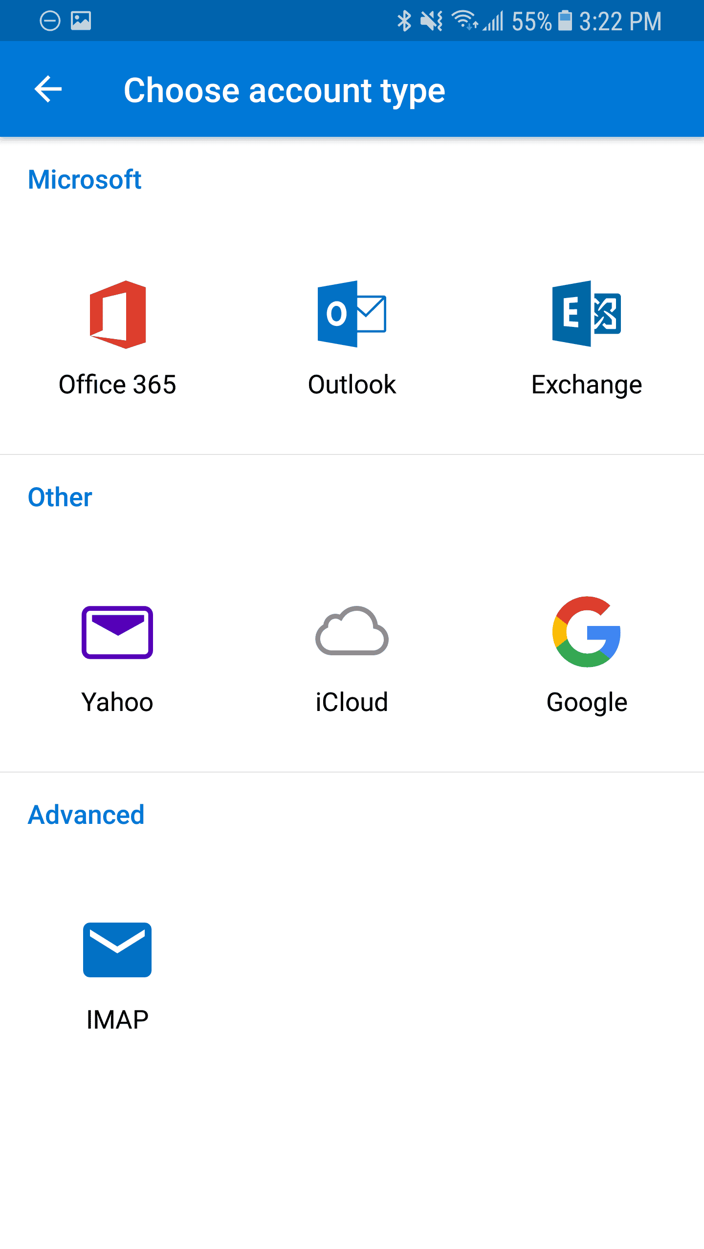 5. Now, the app by default will choose Exchange. Tap on the white Question Mark icon on the top left