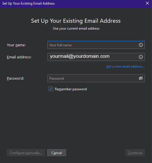 4. In the Set Up Your Existing Email Address window, input the following information before hitting Configure manually