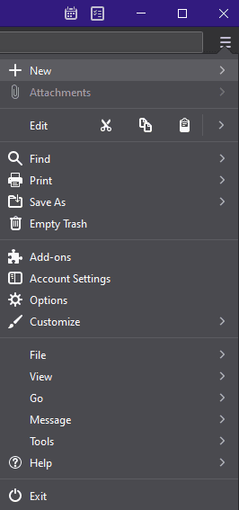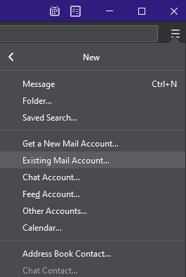 - When Thunderbird opens, select the hamburger menu in the top right and then New.